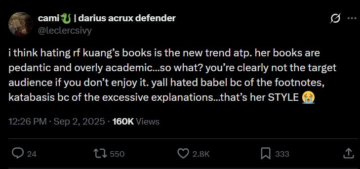 One is that RF Kuang’s been gaining more mainstream fame, so she’s gaining more and more new readers. Readers who come to Kuang outside of BookTok, who come to Kuang without having been exposed to her style. With a wider audience comes more scrutiny and more criticism. That’s just how it is.